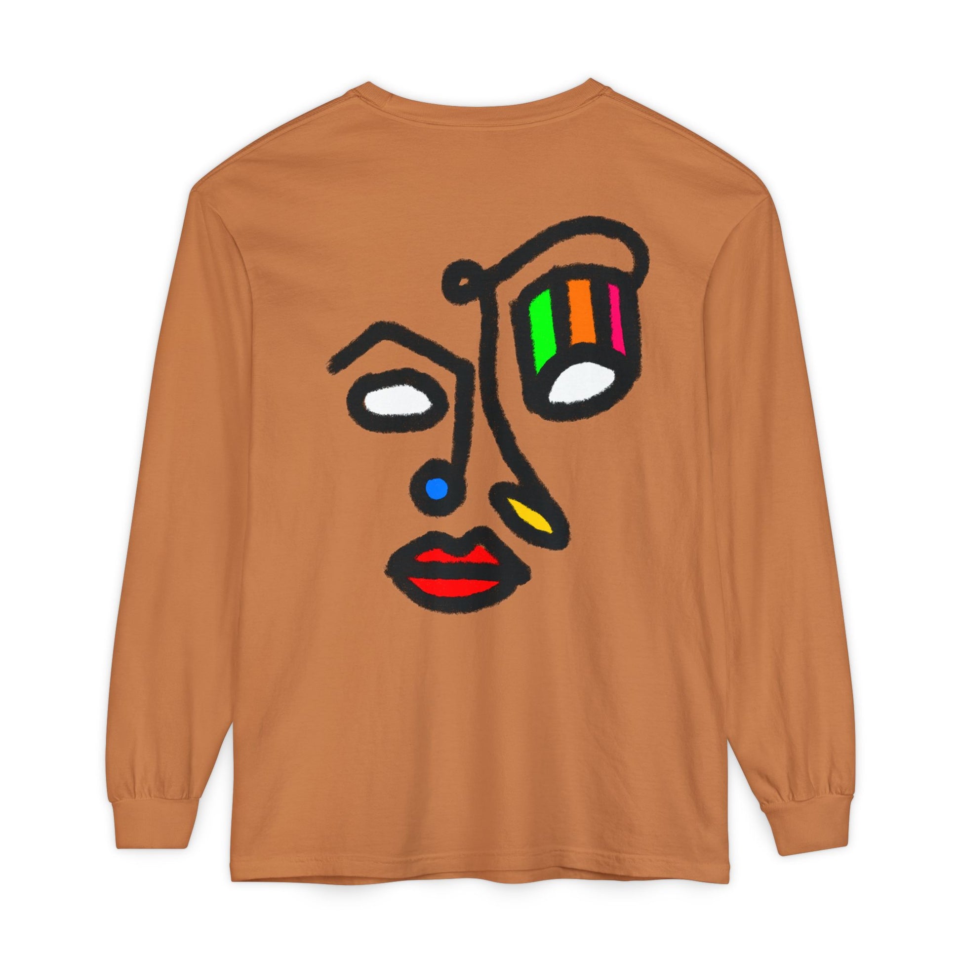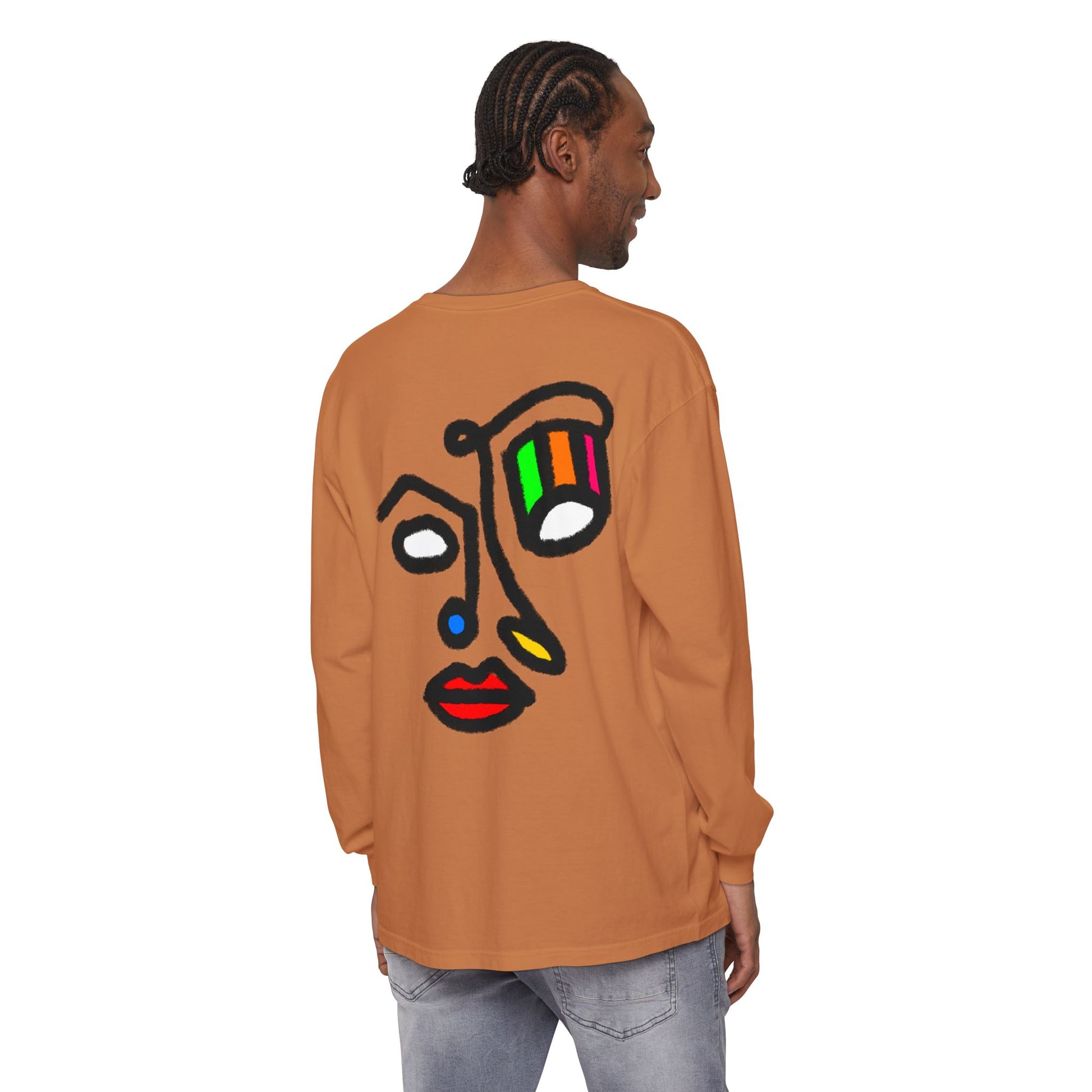 A soft, garment-dyed long sleeve that feels lived-in from the first wear. The clean white cotton carries a bold, hand-drawn face on the back — playful, abstract lines with pops of color that read like a sketchbook tucked into a city notebook. Wear it to loosen up a muted wardrobe or to layer under a jacket when you want a quiet statement. It sits comfortably in a classic fit, with ribbed cuffs that hold their shape and double-stitched hems that stand up to daily wear. Lightweight enough for all-day comfort, this tee becomes a familiar favorite — the kind you reach for on slow mornings, gallery nights, and casual meetups with people who get your aesthetic.