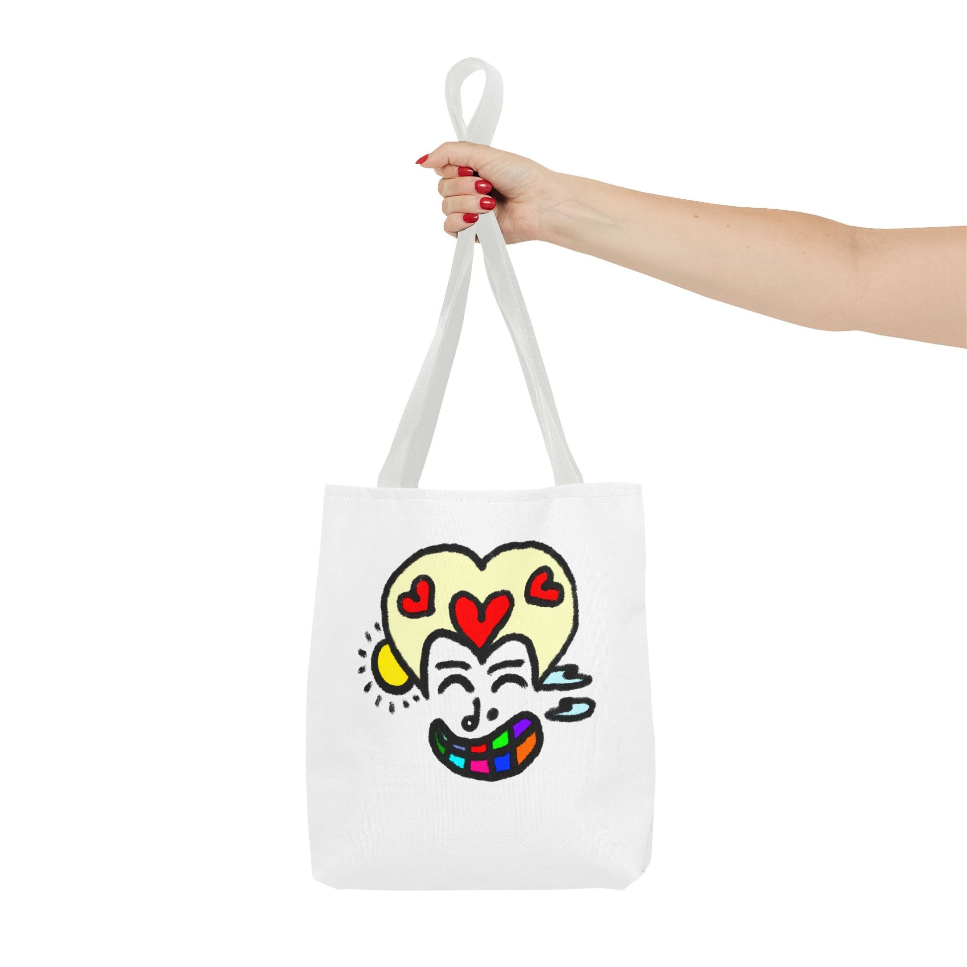 Bright, playful, and built for everyday adventures — this tote turns errands into moments of joy. A bold, hand-drawn face with heart-shaped hair and a rainbow smile sits centered on a clean white canvas, sending upbeat energy wherever you go. Lightweight but sturdy, the polyester body keeps its shape and dries fast, while boxed corners add roomy depth for groceries, sketchbooks, or market finds. Choose a handle color to match your mood; reinforced stitching and a laminated interior mean it holds up to daily use without losing its charm.